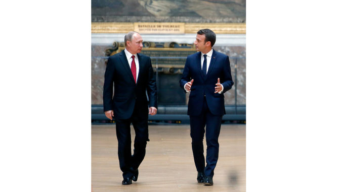 Peu de temps après son élection, il recevait Vladimir Poutine dans le faste et la grandeur de Versailles, faisant taire les nombreuses voix qui lui conseillaient de ne pas rencontrer le président russe, et notamment les médias français, relativement hostiles à Poutine.